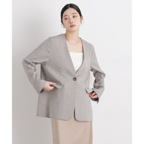さらっとラフに羽織れる、ラペルレスのリネンライクジャケット。1つ釦のシンプルなフロントと一枚仕立ての軽やかな着心地で、カーディガン感覚で取り入れられるアイテム。リネンのような表情とドライなタッチが魅力の素材を使用し、きれいめからカジュアルまで幅広いスタイルにマッチする1着です。