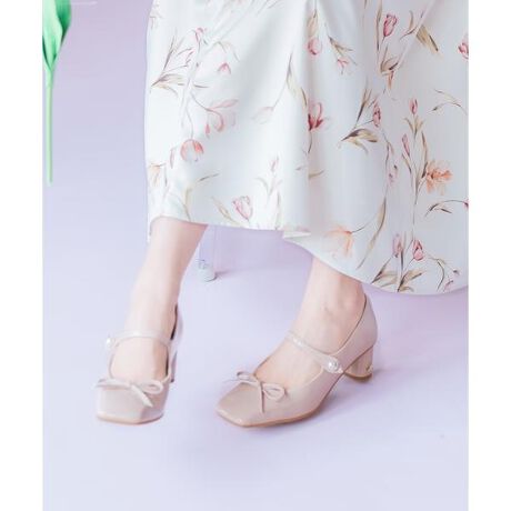可愛らしさと上品さを兼ね備えた、スクエアトゥメリージェーン【Design】・つま先はスクエアデザインで、トレンド感のあるスタイリッシュな印象に。・程よい光沢感で足元を華やかに演出。・甲部分には細いリボンをあしらい、さりげないアクセントに。・ストラップにはパールと細リボンをあしらい、上品でフェミニンな印象をプラス。・カジュアルからきれいめまで幅広くコーディネートできる万能シューズです◎