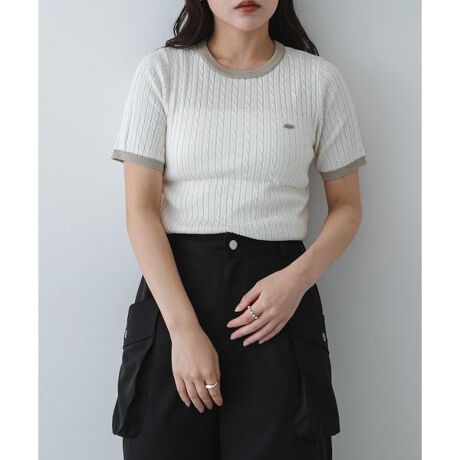 表情豊かなミニケーブル編みが目を惹く、清涼感あふれる半袖ニット。ストレッチ性に優れながらも、さらりとした肌触りで、等身大の日常を快適に彩ります。首元と袖口のバイカラー配色が、クリアでシンプルなコーディネートの絶妙なアクセント。胸元に添えた小さなメタルプレートが、今季らしい洗練されたニュアンスを醸し出し、一枚で着ても羽織りのインナーとしても自分らしく映える一着です。
