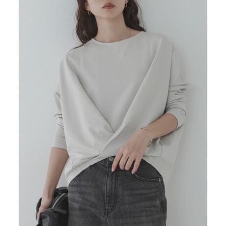 体型を拾わないゆとりのある身幅とカットソー素材でラフな着心地ながら、フロントタック&ドレープデザインできちんと感もあるアイテムです。