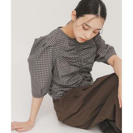 フロントにギャザーをたっぷりと取り入れ、チェック柄を使用した女性らしいブラウス。二の腕カバーが期待できる、立体感のある袖もポイントです。コンパクトな着丈なので、少しボリュームのあるボトムと合わせていただく着こなしがおすすめです。