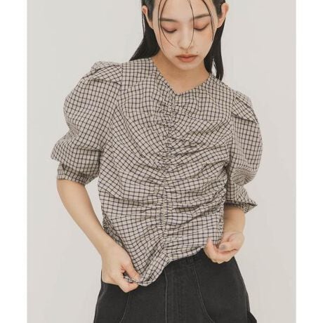 フロントにギャザーをたっぷりと取り入れ、チェック柄を使用した女性らしいブラウス。二の腕カバーが期待できる、立体感のある袖もポイントです。コンパクトな着丈なので、少しボリュームのあるボトムと合わせていただく着こなしがおすすめです。