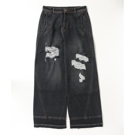 クラッシュ加工とサイドの切り替え、裾のステッチとデザインが効いたデニムパンツ。
