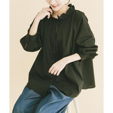 ハリ感のある素材がきれいなフォルムを保ち、上品で洗練された印象を与えるネックフリルブラウス。首元のフリルが顔まわりを華やかに演出し、シンプルながらも存在感のあるデザインです。袖口のギャザーがほどよいボリュームを生み、袖をまくっても美しいシルエットをキープ。オンオフ問わず活躍し、大人カジュアルからきれいめスタイルまで幅広く着回せる一枚です。