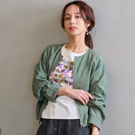 春の装いにピッタリの裏無しで軽やかなジャケット。ブラウスやTシャツの上にさっと織って楽しむことができます。柔らかな色合いが女性らしく、季節にマッチ。