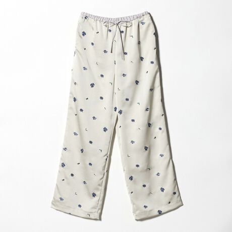 小花柄のエンブロイダリーが目をひくイージーパンツ。