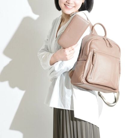 リュックサックと同じ牛革シュリンクレザーを使用しているため、セットでご使用いただくとオシャレで統一感のあるスタイリングに。
