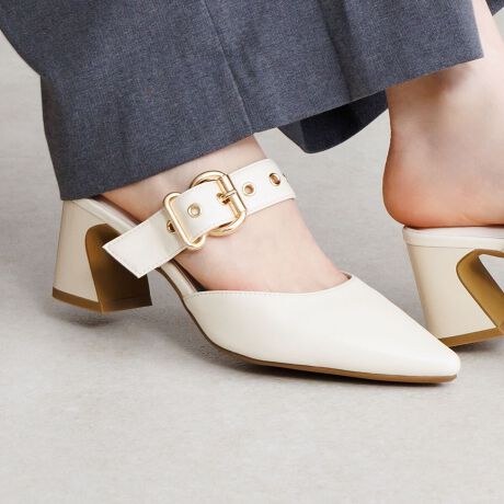 存在感のある太幅のベルトを大胆に添えたミュールパンプス。