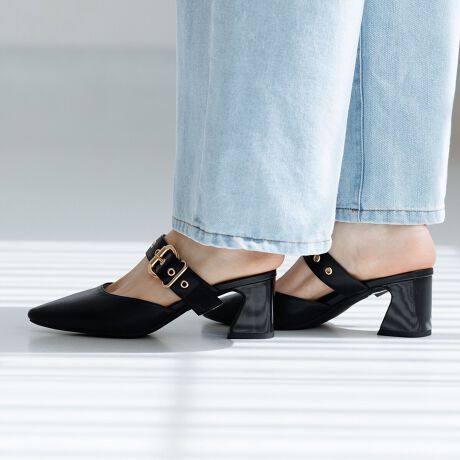 存在感のある太幅のベルトを大胆に添えたミュールパンプス。