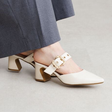 特別なWEB限定アイテムに新デザインが登場。存在感のある太幅のベルトを大胆に添えたミュールパンプス。
