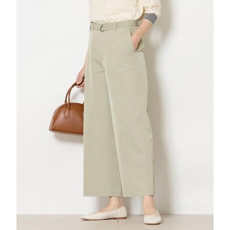 スタイリングのポイントになる共地ベルト付きのチノパンツ。ミリタリーパンツをデザインソースに、ややカーブをつけた太めのシルエットで脚のラインを拾わず、きれいに見せてくれます。カジュアルになりすぎない表情で、大人のきれいめスタイルにも好相性。裏地なし。ポケットあり・