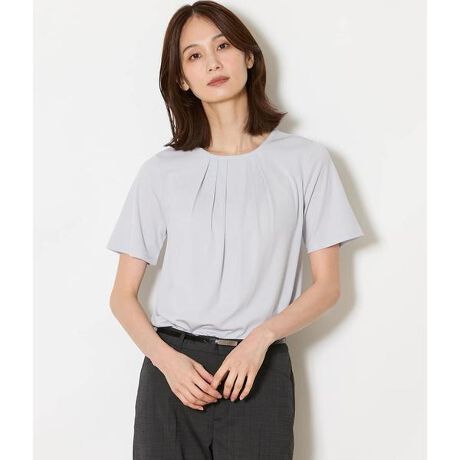 クルーネックの半袖プルオーバー。胸元にタックを施し、ジャケットを羽織った際もアクセントになるデザインに仕上げました。裾は切り替え仕様で、ボトムにインせずともバランス良く決まります。