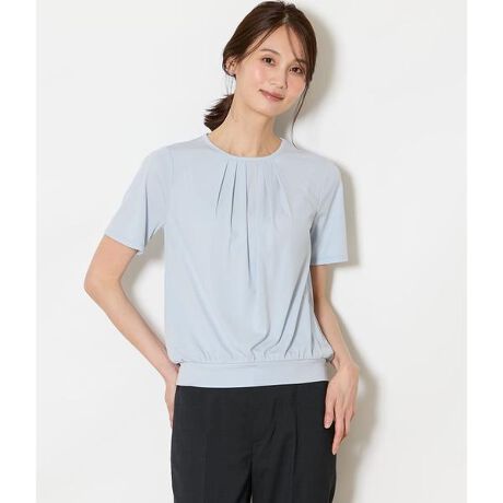 クルーネックの半袖プルオーバー。胸元にタックを施し、ジャケットを羽織った際もアクセントになるデザインに仕上げました。裾は切り替え仕様で、ボトムにインせずともバランス良く決まります。