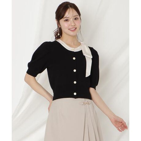 さりげない甘さを添える、リボンパフカーディガン【Design】・左肩にあしらったリボンデザインがコーディネートのアクセントになるトップス。・パフスリーブ仕様で程よいボリューム感が女性らしいシルエットを演出します♪・フロントには大理石風ボタン×ゴールド縁を使用し、上品な華やかさをプラス!・すっきりとした丈感で、スカートにもパンツにも合わせやすいバランスに◎【Fabric】・やわらかな風合いのニット素材を使用し、心地よい着用感に。・ご自宅でお手入れが出来るのも嬉しいポイント♪・ピンクベージュ、ピンク、レッド、サックス、ミント、ネイビー、ネイビーボーダー、ブラックの8色展開となります。【Care】手洗い可能