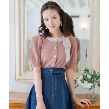 さりげない甘さを添える、リボンパフカーディガン【Design】・左肩にあしらったリボンデザインがコーディネートのアクセントになるトップス。・パフスリーブ仕様で程よいボリューム感が女性らしいシルエットを演出します♪・フロントには大理石風ボタン×ゴールド縁を使用し、上品な華やかさをプラス!・すっきりとした丈感で、スカートにもパンツにも合わせやすいバランスに◎【Fabric】・やわらかな風合いのニット素材を使用し、心地よい着用感に。・ご自宅でお手入れが出来るのも嬉しいポイント♪・ピンクベージュ、ピンク、レッド、サックス、ミント、ネイビー、ネイビーボーダー、ブラックの8色展開となります。【Care】手洗い可能