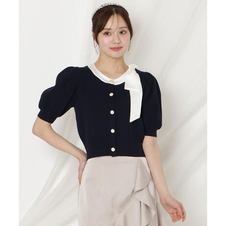 さりげない甘さを添える、リボンパフカーディガン【Design】・左肩にあしらったリボンデザインがコーディネートのアクセントになるトップス。・パフスリーブ仕様で程よいボリューム感が女性らしいシルエットを演出します♪・フロントには大理石風ボタン×ゴールド縁を使用し、上品な華やかさをプラス!・すっきりとした丈感で、スカートにもパンツにも合わせやすいバランスに◎【Fabric】・やわらかな風合いのニット素材を使用し、心地よい着用感に。・ご自宅でお手入れが出来るのも嬉しいポイント♪・ピンクベージュ、ピンク、レッド、サックス、ミント、ネイビー、ネイビーボーダー、ブラックの8色展開となります。【Care】手洗い可能