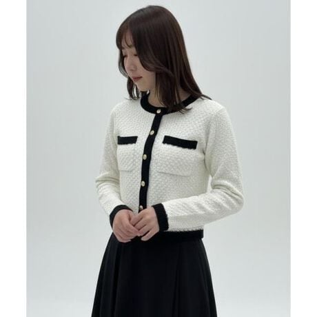 【クラシカルな配色デザインが映える、ニットジャケット】【Point】・表情のあるバスケット編みと配色トリムが、上品でクラシカルなムードを演出するニットジャケット。・フロントのゴールドボタンがさりげないアクセントになり、きちんと感のある印象に仕上げます。・コンパクトな丈感でバランスが取りやすく、スカートにもパンツにも好相性◎・胸元のポケットデザインが、さりげなく華やかさをプラスします。・程よく厚みのあるニット素材で、カーディガン感覚でさっと羽織れるのも嬉しいポイント。・オンでもオフでも幅広く活躍する、着回し力の高いニットジャケットです。ケア方法:透け感:なし裏地:なし伸縮性:あり光沢感:なし生地の厚さ:中肉