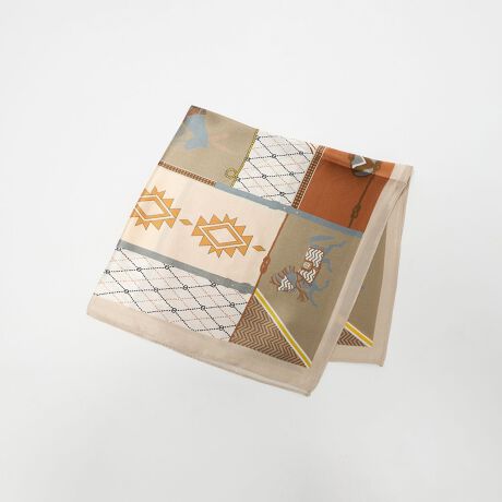 レトロなムードを感じる配色が目を惹く馬柄のシルクスカーフ。