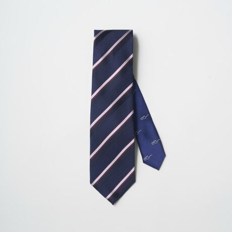 大剣のストライプは、どんな商談やプレゼンでも信頼を勝ち取れるシャープな印象に。 一方で、小剣の眼鏡刺繍は、会話のきっかけ(アイスブレイク)を生む、素敵なきっかけになるはずです。 自分だけが知っている「お守り」のような遊び心を、胸元に飾ってみませんか。