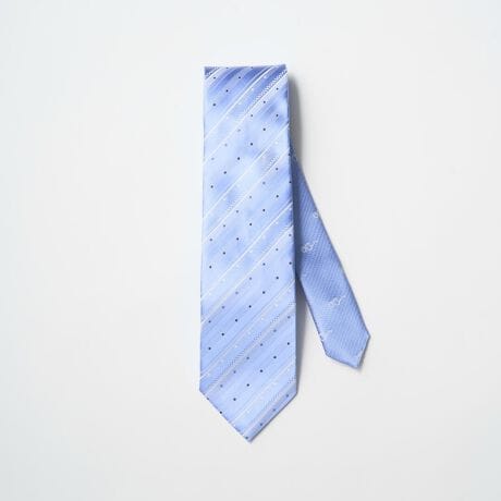 大剣には、繊細な織組織の変化で表現したストライプと、上品なドットを組み合わせた奥行きのあるデザインを採用。