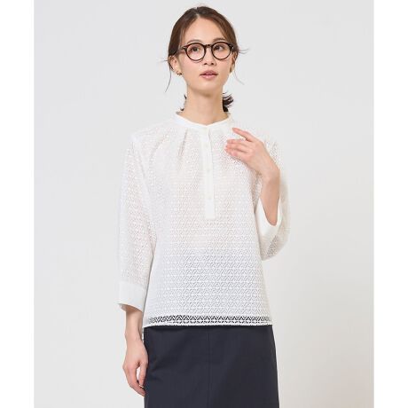■デザイン身頃全体に幾何柄レースをあしらった、バンドカラーカットソー。襟元にはタックを施し、立体感と女性らしい柔らかなニュアンスをプラス。襟、前立て、カフスにレースと同色の無地素材を使用することで、レースの柄がより一層引き立ち、洗練されたコントラストを生み出しています。さらっとした肌触りの裏地が付いているため、透け感を気にせず1枚で安心してご着用いただけます。日常使いはもちろんのこと、オフィススタイルや少しきちんと感が必要な会食など、幅広いシーンで活躍する1着です。