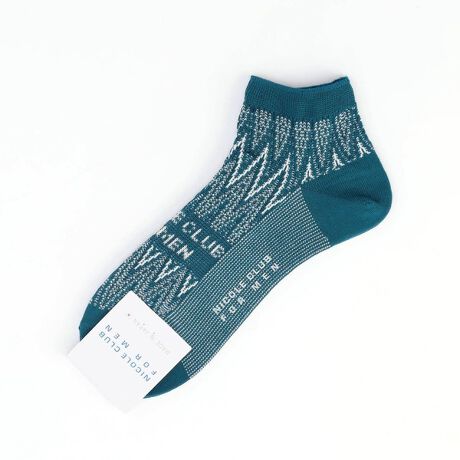 シェブロン(ヘリンボン)柄×ロゴデザインのショート丈ソックス。兵庫県の専門工場で製造した上質な仕上がりの日本製ソックスです。ピッチアレンジを効かせた細やかなシェブロン柄をベースに、足の甲にはスタイリッシュな印象のブランドロゴをジャカードで表現したオリジナリティ溢れる一足。スニーカーとの相性が特にピッタリのソックスです。ブランドネーム入りの口紙付き包装なので、ちょっとしたギフトにもおすすめです。