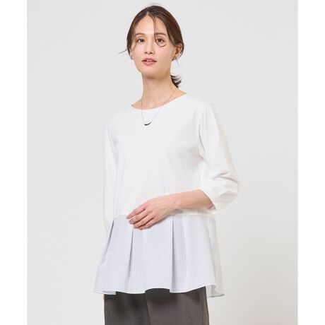 ■デザイン裾に異素材を組み合わせた、レイヤードスタイルに活躍するカットソー。裾にタックを入れ、ふわりと空気をはらむフレアシルエットがポイント。素材の持つ落ち感により、広がりすぎず上品なデザインに仕上げました。気になるヒップラインを自然にカバーしながら、動く度に揺れる裾が女性らしさを引き立てます。ニットやジャケットとのレイヤードスタイルに活躍する汎用性の高いアイテムです。
