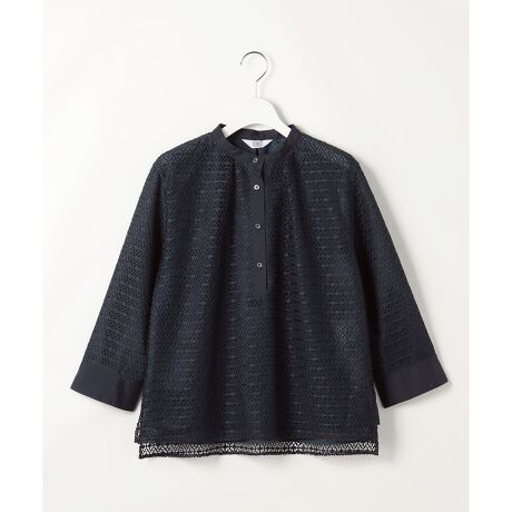 ■デザイン身頃全体に幾何柄レースをあしらった、バンドカラーカットソー。襟元にはタックを施し、立体感と女性らしい柔らかなニュアンスをプラス。襟、前立て、カフスにレースと同色の無地素材を使用することで、レースの柄がより一層引き立ち、洗練されたコントラストを生み出しています。さらっとした肌触りの裏地が付いているため、透け感を気にせず1枚で安心してご着用いただけます。日常使いはもちろんのこと、オフィススタイルや少しきちんと感が必要な会食など、幅広いシーンで活躍する1着です。