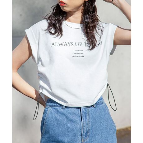 フロントにはシンプルロゴプリントが施されカジュアルなデザインの中にもサイドのドロコード調節でシャーリングデザインの立体的なシルエットが出て女性らしい可愛い雰囲気も表現され目を引くアイテムです◎