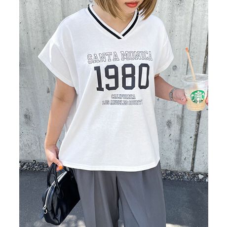 シンプルになりすぎないロゴプリントが施され、Vネックデザインでこなれ感もプラスに。首回りのスッキリ見え+ネックラインの配色が顔回りを明るくさせてくれる魅力的なデザイン。