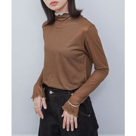程よい透け感のある素材とひらひらとしたメローデザインが大人かわいい印象を与えるシアーハイネックトップスが登場!