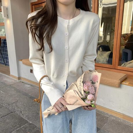 やさしい色合いが印象的なニットカーディガン。