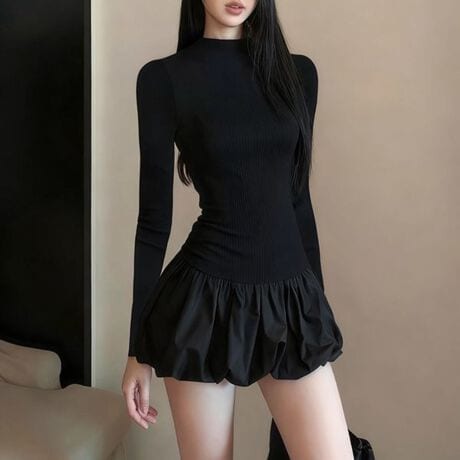 上半身は縦ラインを感じるリブ素材で、すっきりとした印象。裾に向かってふんわり広がるバルーンデザインが今季のトレンド感をプラス。