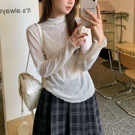 素肌感を楽しむ、今どきレイヤードモックネックシアートップス シアー素材