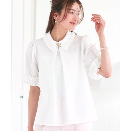 襟と袖口に施したチュールフリルが映える、華やかで洗練された配色展開。