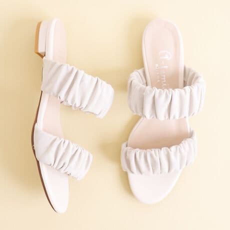 ・シフォンジョーゼットのシャーリングが目をひくミュールサンダル。
