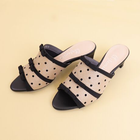 ・ラメの上にフロッキードットのオーガンジーを重ねた華やかなミュールサンダルです。