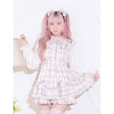 チェック柄にレースやビジューを重ね、華やかさを引き立てたガーリーなセットアップ。
