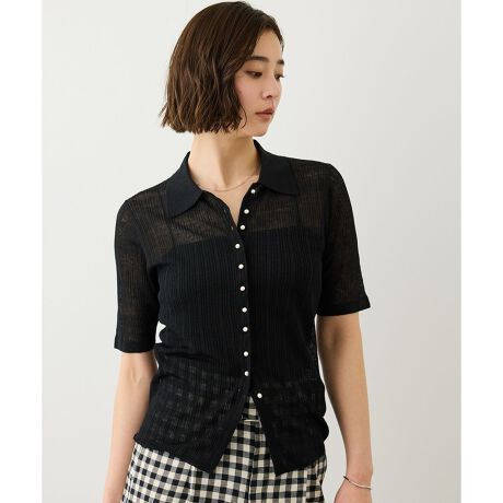 衿付きデザインとパール釦が上品な印象を与え、きちんと感のある装いを演出します。透け感は控えめで、オフィスシーンにも活躍する洗練されたニットアイテムです。