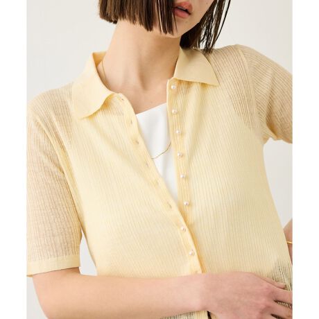 衿付きデザインとパール釦が上品な印象を与え、きちんと感のある装いを演出します。透け感は控えめで、オフィスシーンにも活躍する洗練されたニットアイテムです。