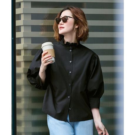 ・フリルのスタンドカラーで、顔まわりを上品に。