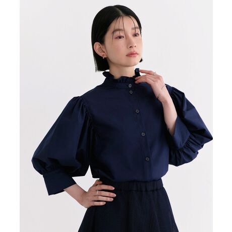 ・フリルのスタンドカラーで、顔まわりを上品に。