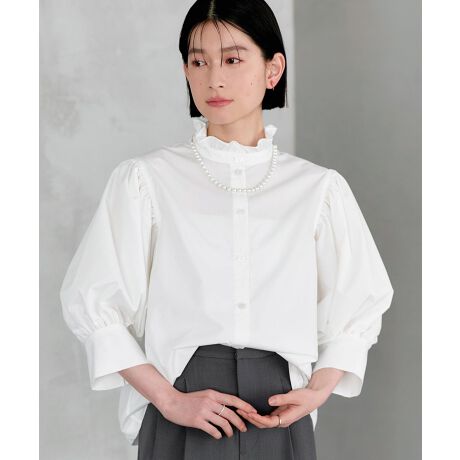 ・フリルのスタンドカラーで、顔まわりを上品に。