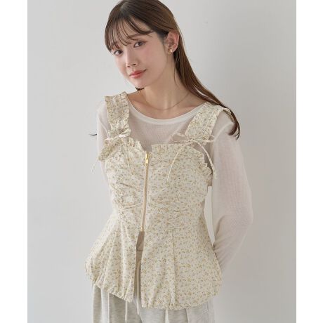 小花柄で叶える、大人可愛い旬レイヤード繊細な小花柄が目を引くデザインで、いつものコーディネートに華やぎを添えてくれます。立体感のあるシャーリングとペプラムシルエットがウエストラインを自然に引き締め、スタイルアップ効果が期待できます。肩のフリルやリボンディテールがやさしいアクセントになり、甘さの中にも上品さを感じさせます。ブラウスやカットソー、タートルネックとのレイヤードはもちろん、ワンピースに重ねる着こなしもおすすめです。シンプルなボトムと合わせるだけで旬のレイヤードスタイルが完成し、デイリーからお出かけまで幅広く活躍します。季節を問わず取り入れやすいフラワー柄トップスとして、着回し力の高い一枚です。透け感[なし]