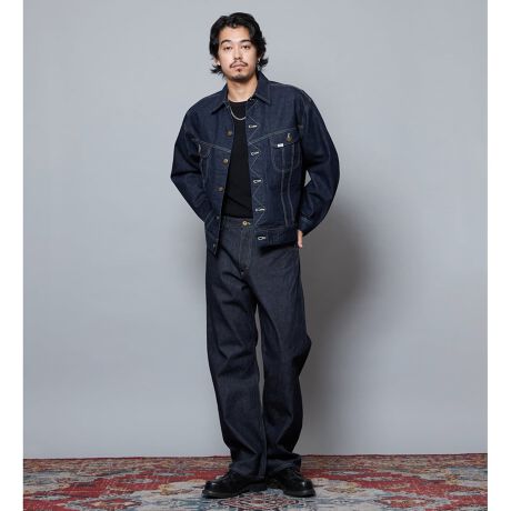 【スタイリング】推奨の「DENIM ON DENIM」スタイル。シンチバックをギュッと絞り、レザージャケットやワークブーツと合わせれば、不変のカッコよさが際立ちます。