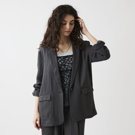 同素材のパンツ(347809)と合わせたセットアップスタイルは、1気に上質感と洗練されたムードが漂い、キレイめでありながらクールな着こなしに。インナーはTシャツやブラウスで、リラクシーな抜け感をプラスして頂くとこなれ感のある雰囲気に仕上がります。