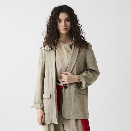 同素材のパンツ(347809)と合わせたセットアップスタイルは、1気に上質感と洗練されたムードが漂い、キレイめでありながらクールな着こなしに。インナーはTシャツやブラウスで、リラクシーな抜け感をプラスして頂くとこなれ感のある雰囲気に仕上がります。