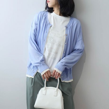 【大きいサイズ】【接触冷感/UVカット】シャイニー天竺レイヤードライクギャザーカーディガン