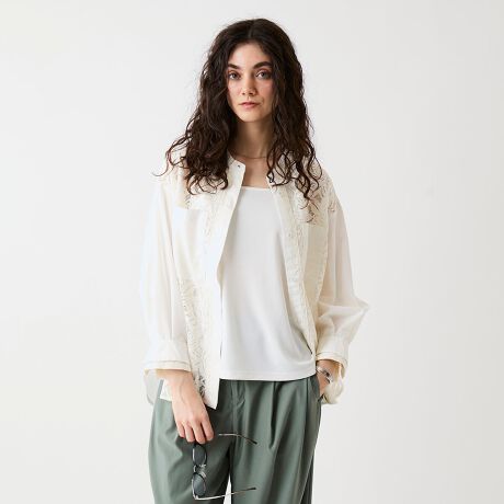 レースの華やかさと、シンプルなシャツのディテールが融合し、1枚で奥行きのある表情を演出。