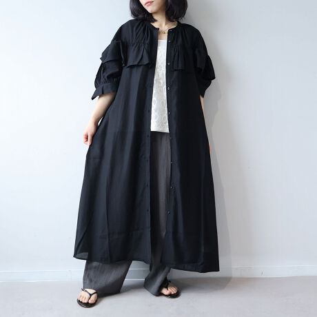 ワンピースとして着用いただくと胸元のフリルとボリューム袖が大人フェミニンな華やかさを演出し、リラクシーながらも上品なスタイルが完成します。